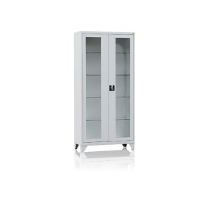 Szafa medyczna posiada dwa skrzydła drzwi uchylnych, zawieszone na zawiasach kołkowych. Wykonana jest z blachy czarnej o grubości 0,8-1 mm. Drzwi szafy posiadają przeszklenie wykonane z szyby hartowanej, zamykane są zamkiem baskwilowym, ryglującym w trzech punktach i wykończonych uchwytem klamkowym. Szafa wyposażona jest w 4 półki wykonane ze szkła hartowanego o maksymalnym udźwigu 25 kg. Malowana jest farbami proszkowymi (epoksydowo-poliestrowymi) w kolorze RAL7035 (jasny popiel). Szafa posiada stopki regulacyjne.